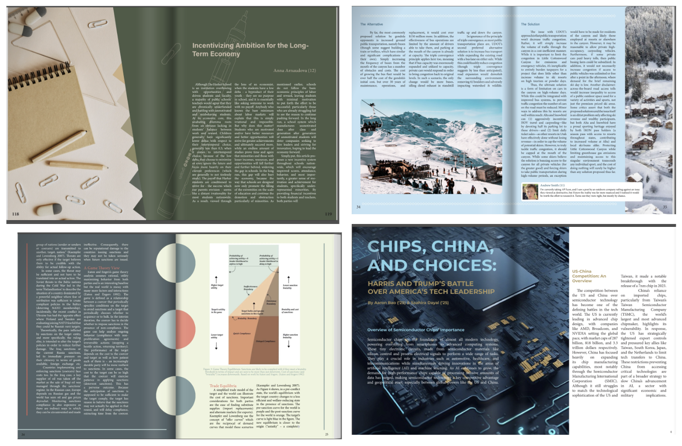 This year, we’re upping our design game to spotlight each work in a well-designed spread. If you’re interested in making these spreads/learning how to do so, we strongly encourage you to join! (Examples below taken from Equilibrium, an economics magazine Sia ran 2024-25)